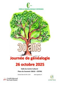 – 30 ans de Généalogie à Cestas (33) https://www.cgcestas.fr/v2/agenda2/les-prochaines-rencontres |