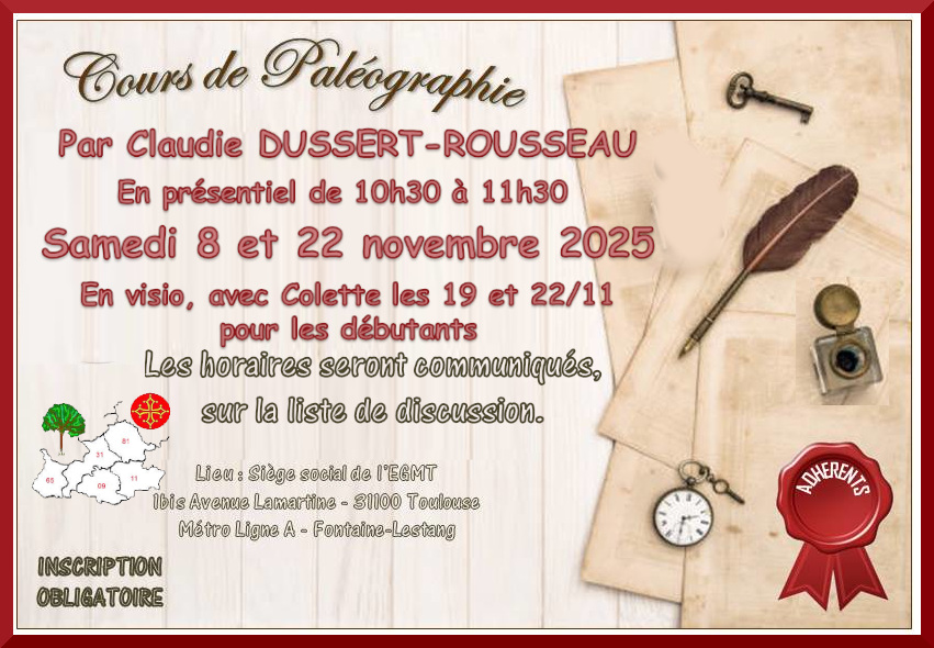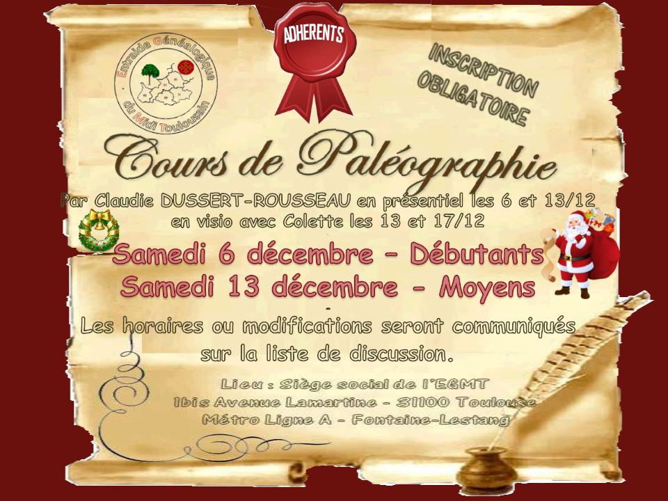 Afin de limiter l’affluence, les cours de paléographie, assurés par Claudie DUSSERT-ROUSSEAU, sont réservés aux adhérents de l’association.
