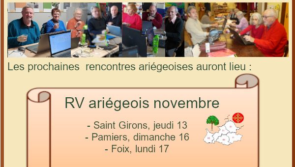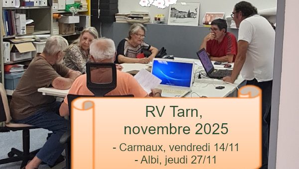 Prochaines rencontres : – jeudi 13 novembre, de 14h à 17h. Saint Girons – https://egmt.org/saint-girons/ – dimanche 16 novembre, de 15h à 18h, Pamiers https://egmt.org/pamiers/ + Rencontres Geneanet – lundi 17 novembre, de 12h45 à 14h et de 17h30 à 19h, Foix https://egmt.org/foix/ – lundi...